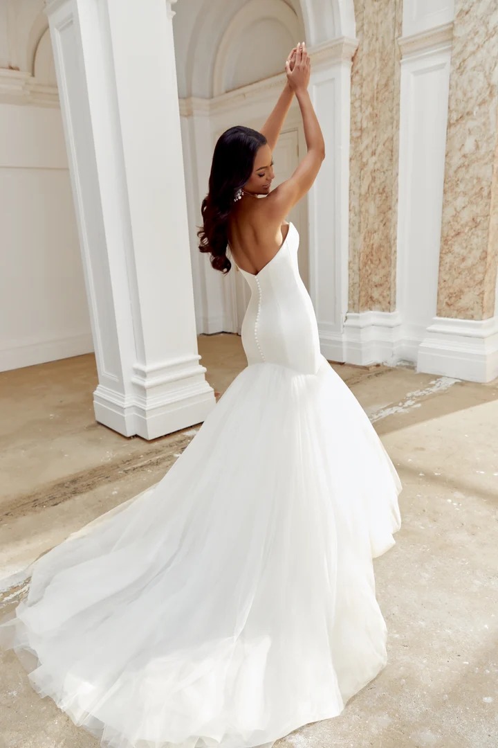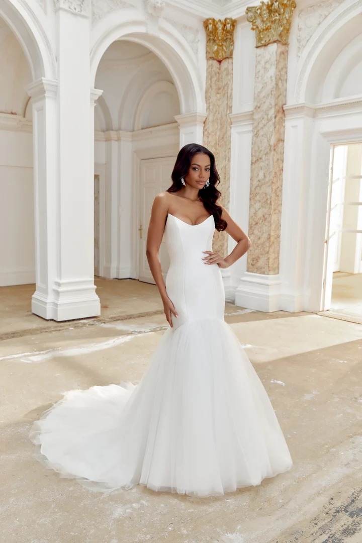 Vestido mikado de corte sirena con escote de ojo de gato sin tirantes y falda de tul.