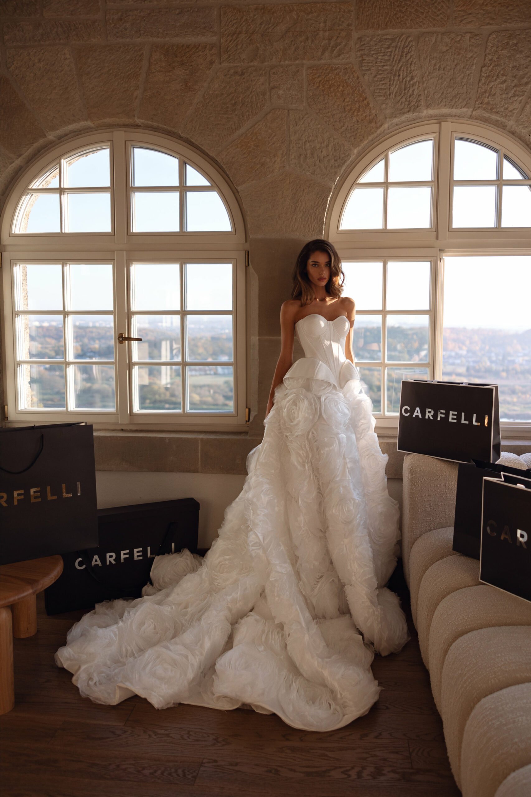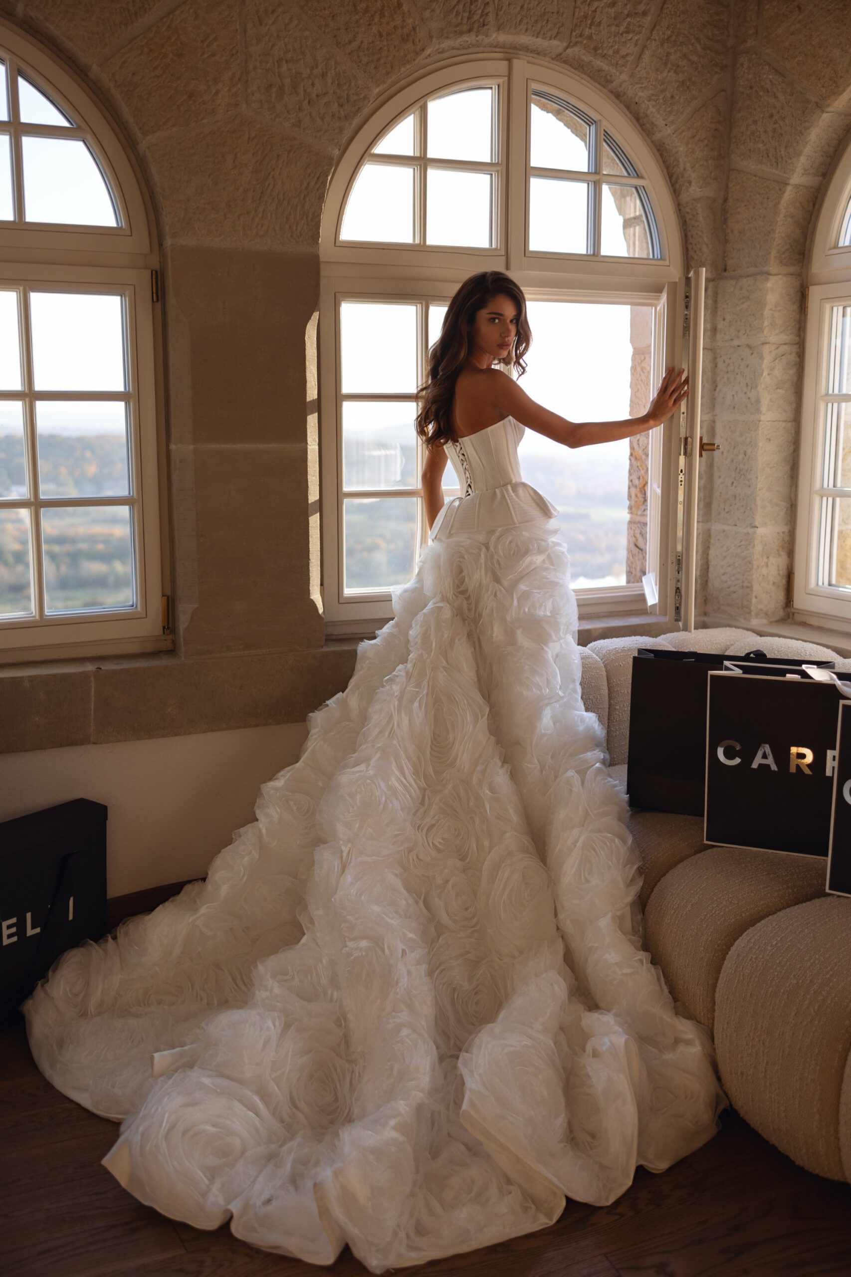 El vestido Gaze es una impresionante combinación de arte moderno y elegancia atemporal. El corsé estructurado, confeccionado en lujoso satén crepé, crea una silueta impecable, realzando la belleza natural de la novia con sus líneas limpias y su ajuste impecable. Combinado con una falda voluminosa, el vestido irradia grandeza, ideal para una entrada impactante. Flores de organza hechas a mano caen delicadamente sobre el diseño, aportando un toque romántico y etéreo a este encantador conjunto.
