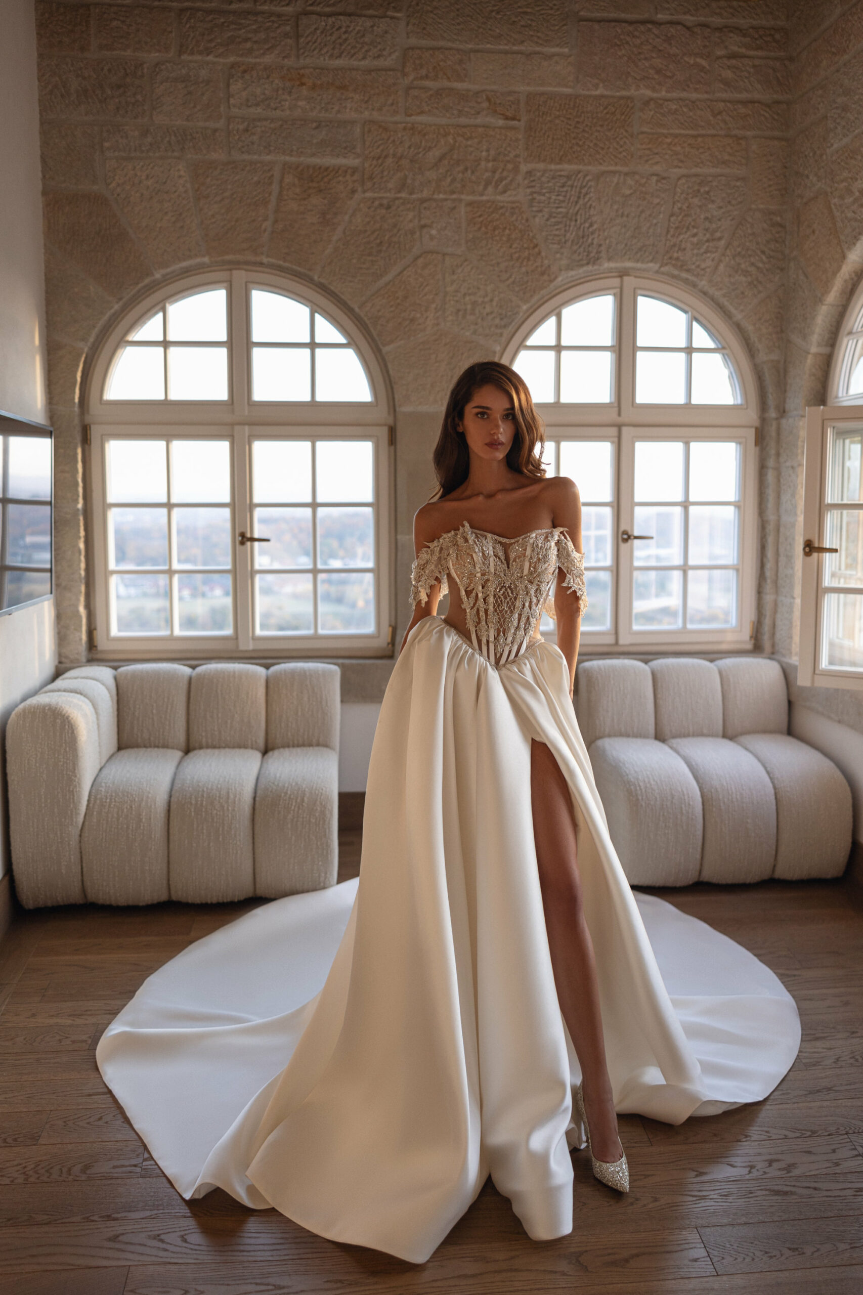 Vestido de novia falda mikado proporciona una base refinada y estructurada, mientras que la pedrería artesanal con lentejuelas añade un toque de opulencia, brillando con cada movimiento. La silueta sin tirantes se realza con tirantes adicionales adornados con intrincados apliques de cuentas artesanales, creando un efecto escultural único.