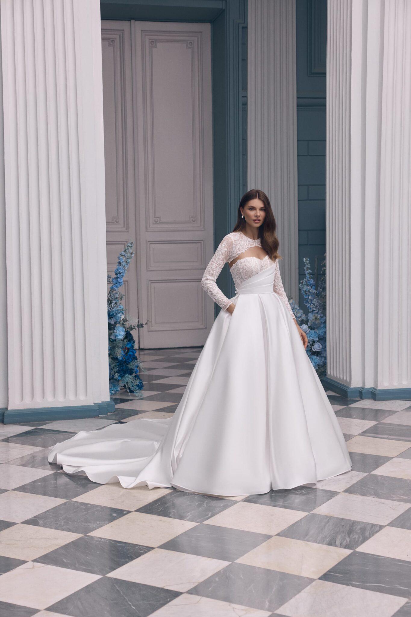 Vestido de novia ampon con corset de encaje y falda de satin con un corset liso que se puede quitar y un bolero de encaje para darle otro look.